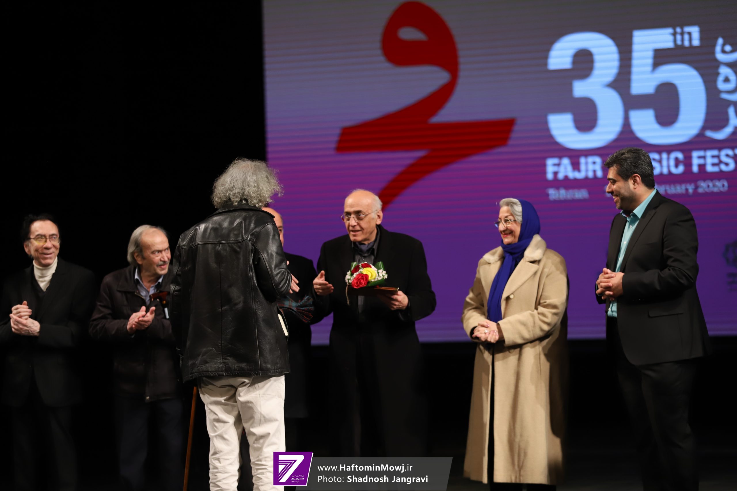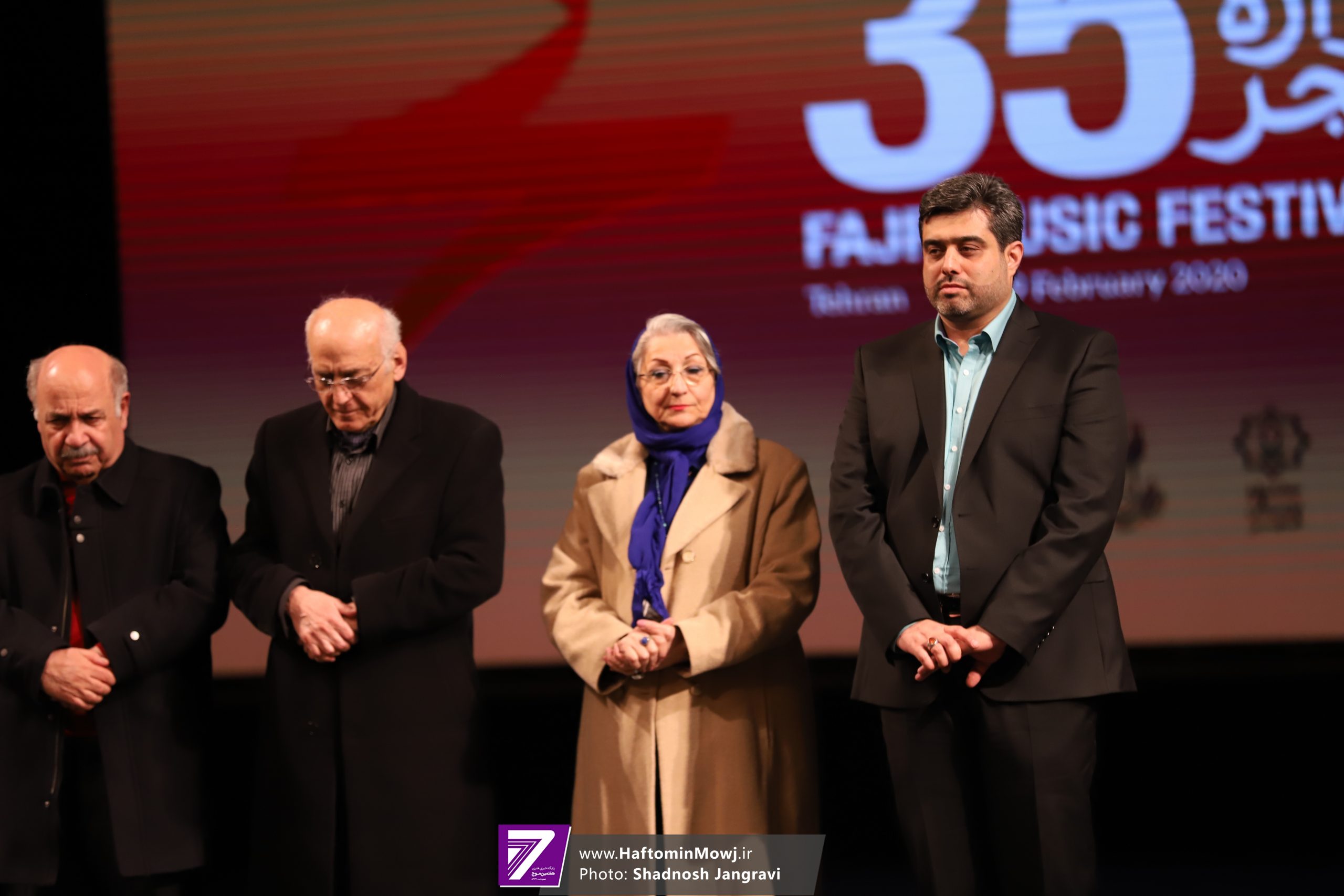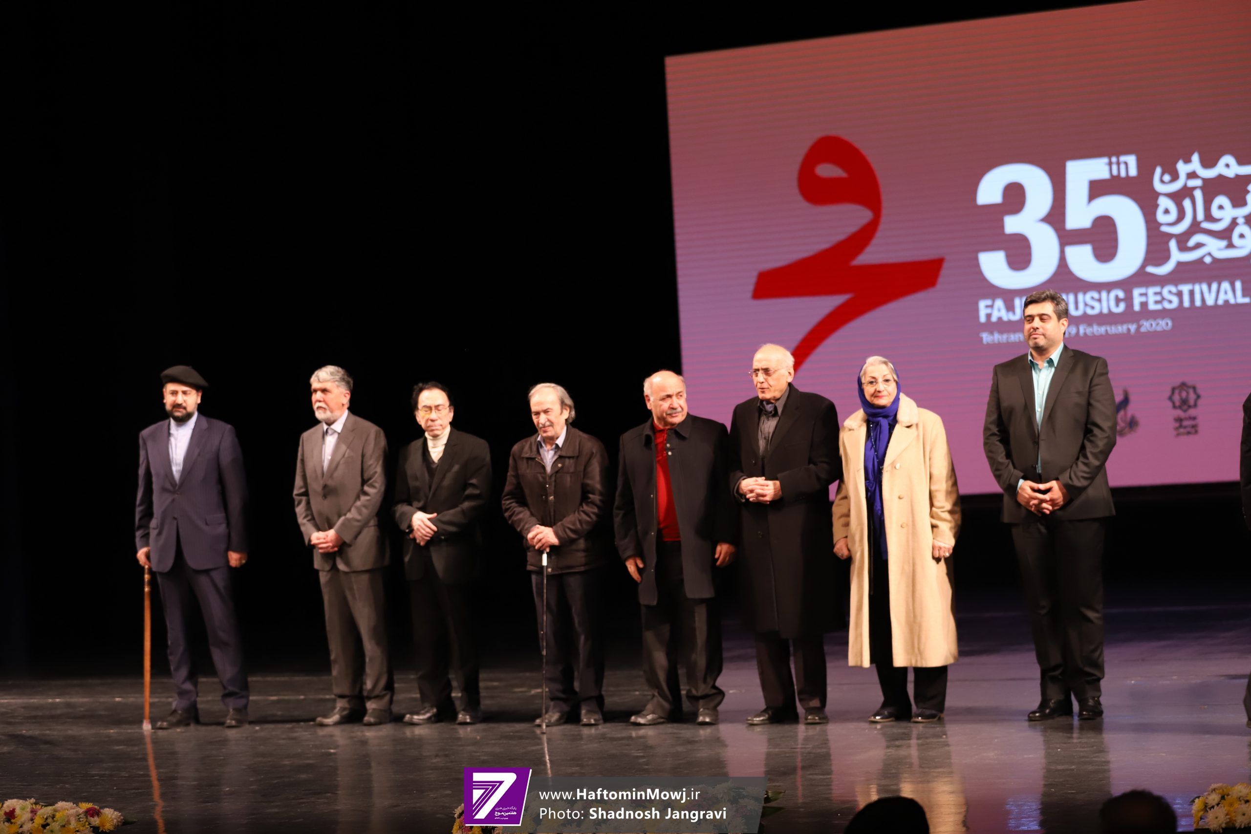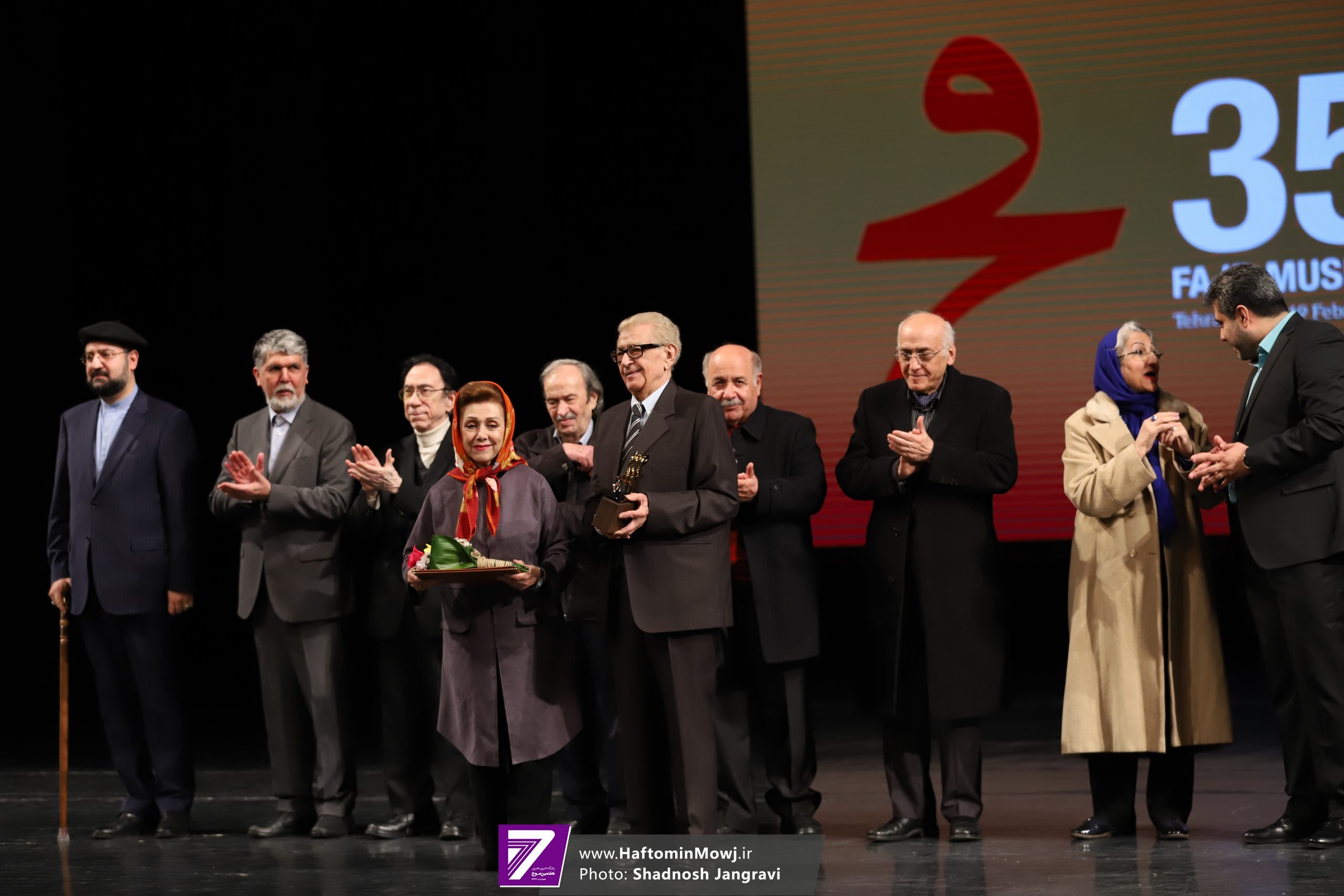 تصاویری از بزرگان موسیقی ایران که شامل هوشنگ ظریف، افلیا پرتو، نادر مشایخی و عاشیق حسن اسکندری بود، در کلیپ بزرگداشت، پخش شد. در طول اجرای سی و پنجمین جشنواره موسیقی فجر، چهار ویدئو مستند از چهار هنرمند بزرگ ایران اکران شد. در آیین اختتامیه مختصری از این چهار ویدئو برای حاضران در تالار وحدت به نمایش درآمد تا از این هنرمندان تجلیل شود. بعد از آن مجری از وزیر محترم فرهنگ و ارشاد اسلامی، جناب آقای دکتر سید عباس صالحی، جناب آقای محمد اله یاری و شاهین فرهت برای اهدا هدایا دعوت کرد. در این بخش از استاد هوشنگ ظریف، استاد افلیا پرتو، استاد حسن اسکندری و استاد نادر مشایخی تقدیر به عمل آمد.