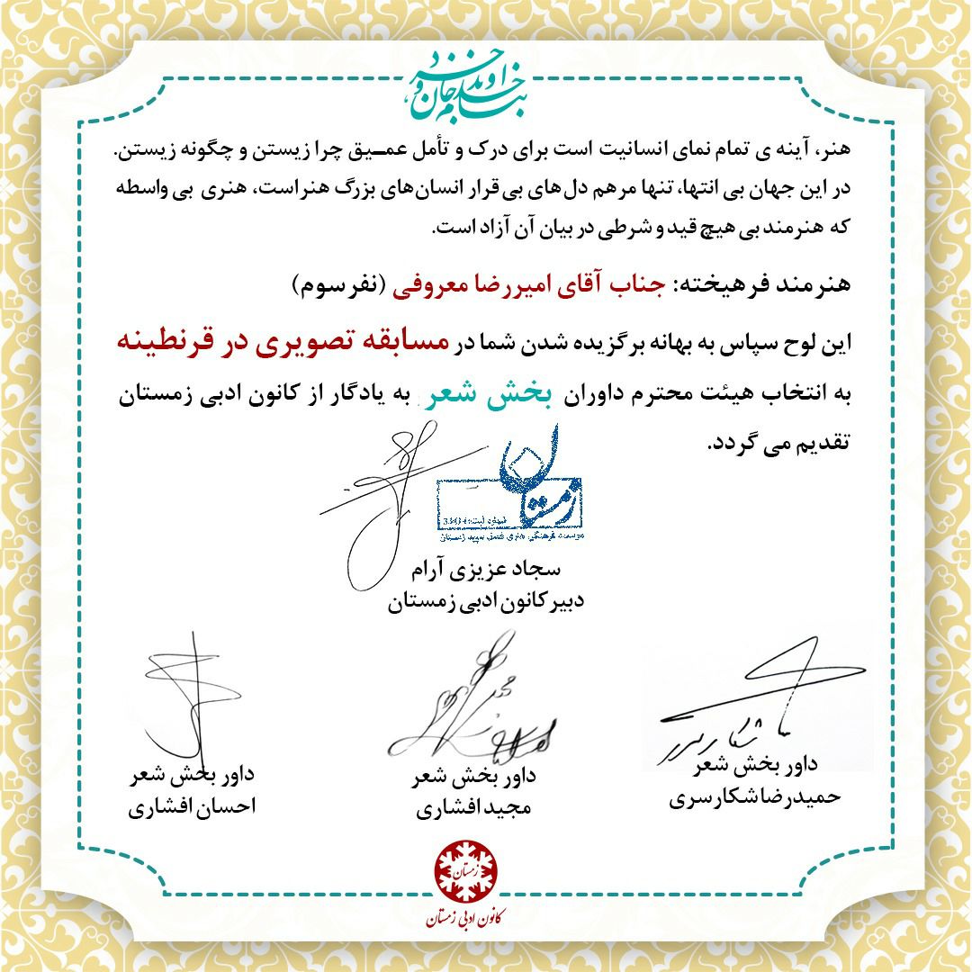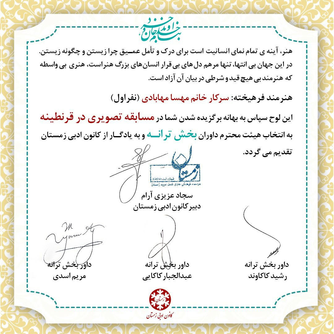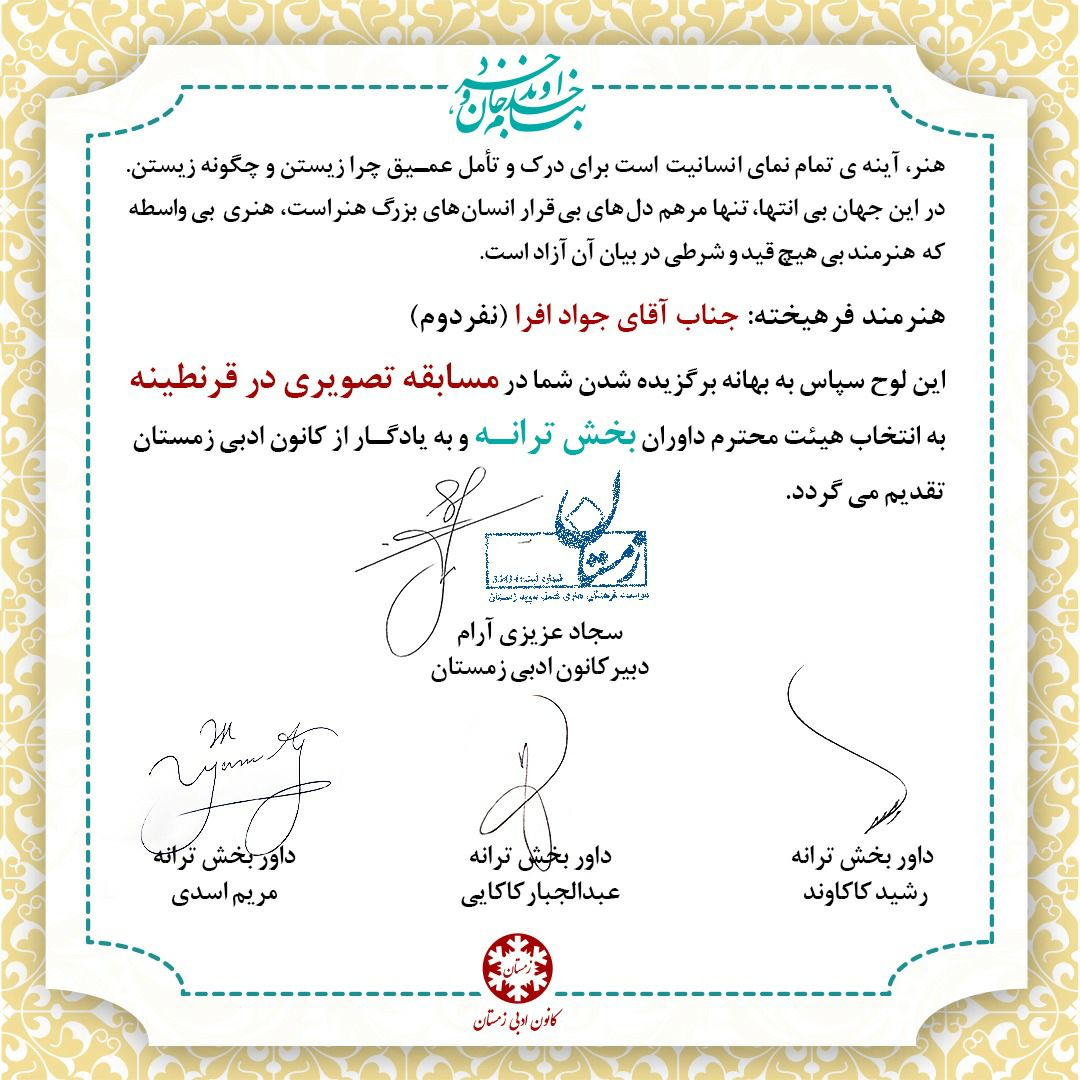 لوح تقدیر نفراتِ برتر کانون ادبی زمستان در بخش ترانه شعر و بهترین صدا