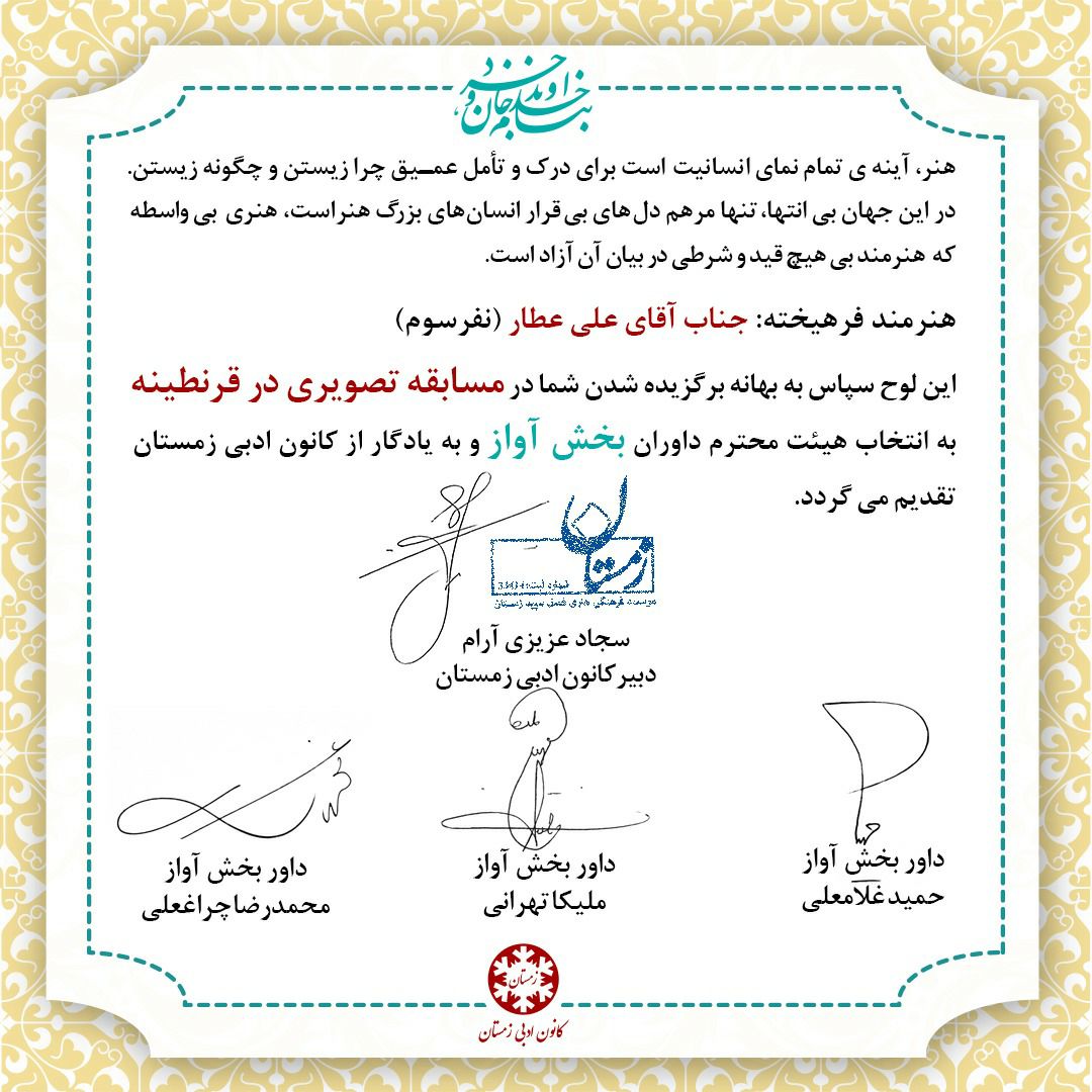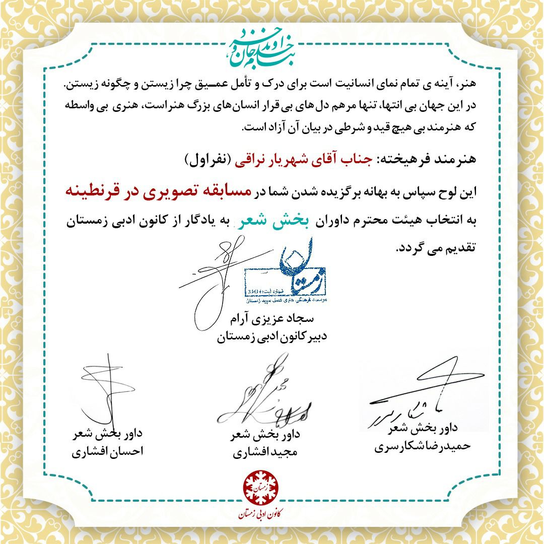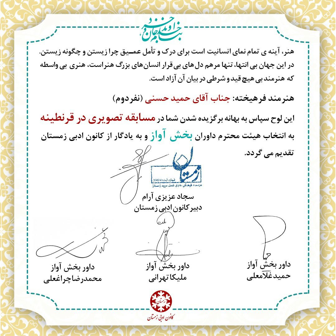 لوح تقدیر نفراتِ برتر کانون ادبی زمستان در بخش ترانه شعر و بهترین صدا