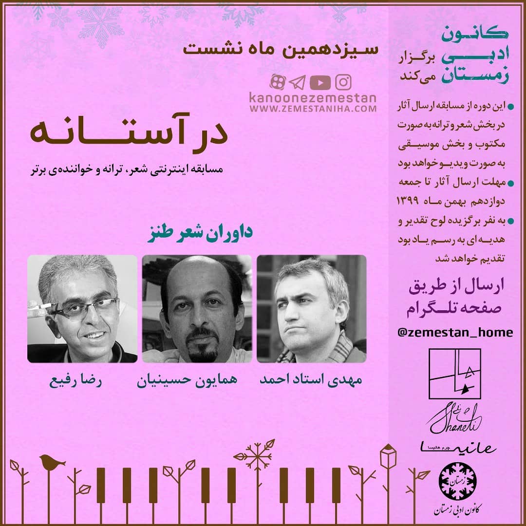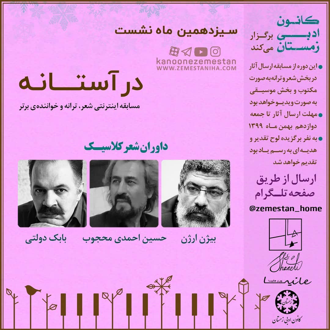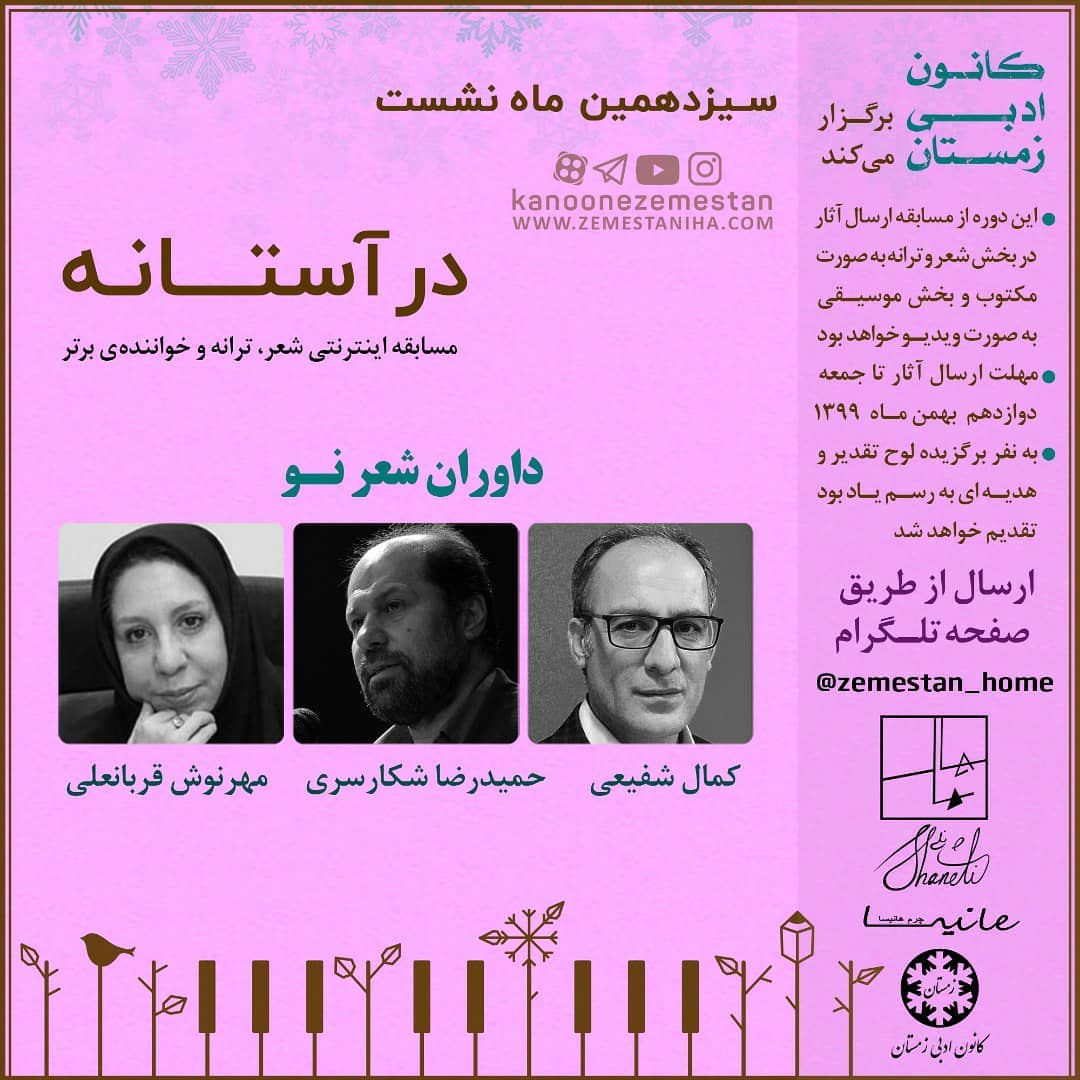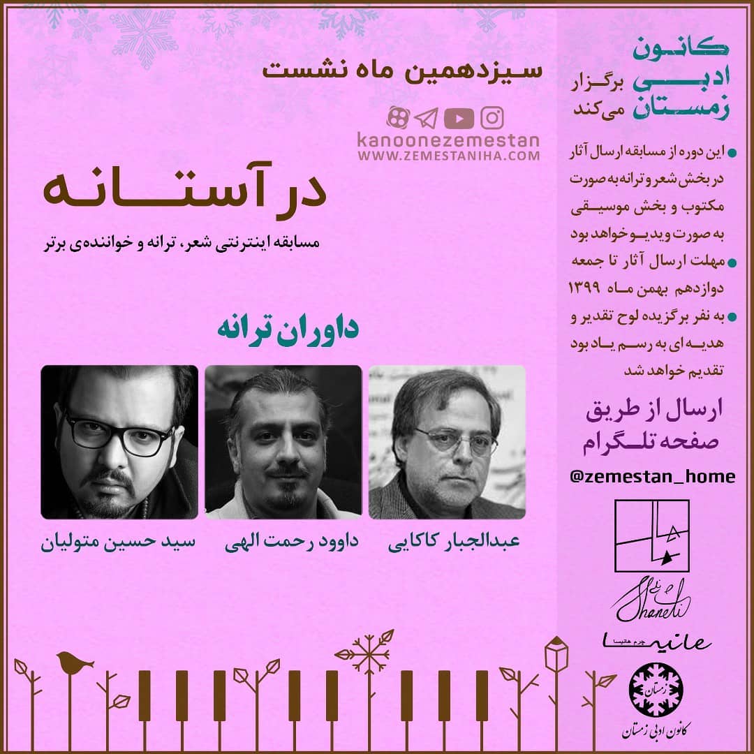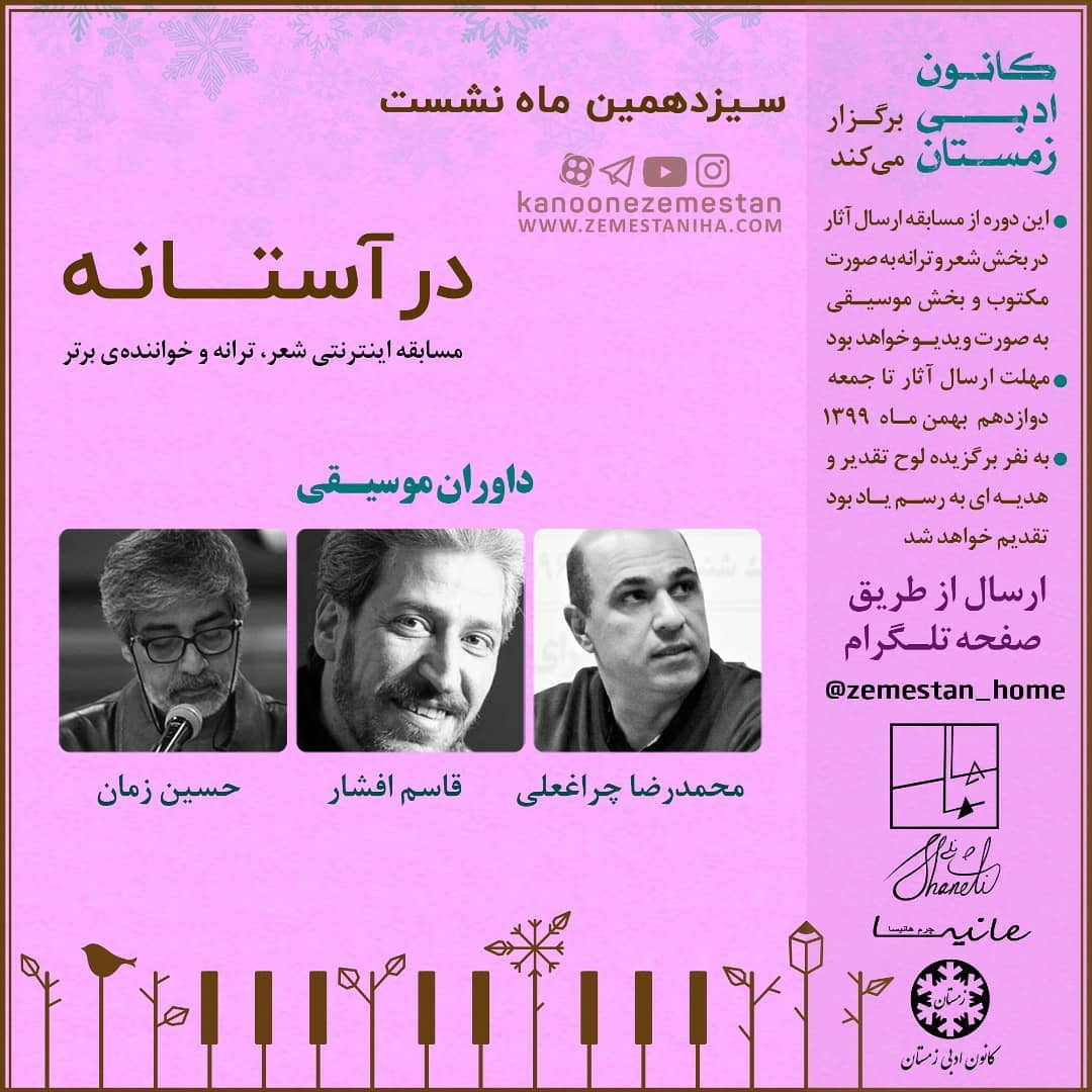 ✅ این مسابقه در بخش شعر و ترانه ابتدا به صورت مکتوب و در بخش فینال تصویری است و بخش خوانندگی به صورت کامل تصویری است. آدرس تلگرامی جهت ارسال اثر @zemestan_home