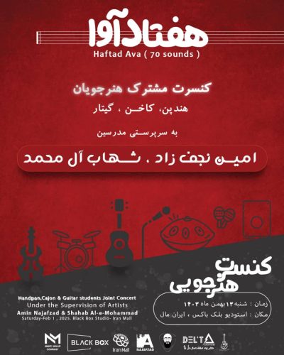 کنسرت هنرجویان آکادمی امین نجفزاد و شهاب آلمحمد در تاریخ ۱۳ بهمن ۱۴۰۳ طی یک سانس ۱۹:۳۰ در سالن بلک باکس ایران برگزار خواهد شد. این رویداد با همکاری آموزشگاه موسیقی مهرنوا برگزار میشود و فرصتی است برای نمایش توانمندیها و تلاشهای هنرجویانی که ماهها با عشق و پشتکار به تمرین پرداختهاند.